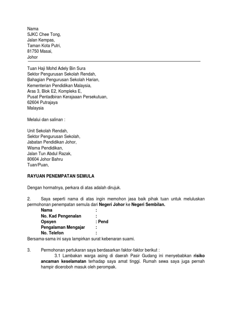 Surat Rayuan Pertukaran Tempat Kerja Letter 7saudara Com